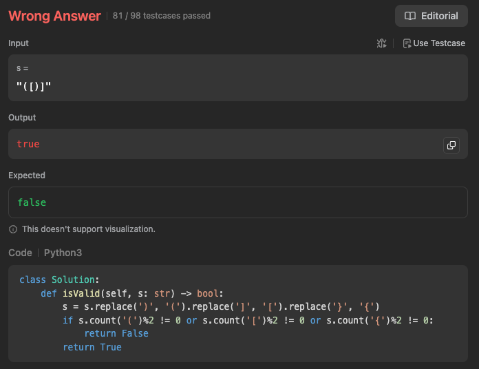 ์ง์ง ๋จ์ง ์ง๋ง ๋ง์ผ๋ฉด ๋๊ธฐ์, ๊ฐ์ ๊ดํธ ์ง์ ๊ฐ์ธ์ง ํ์ธํ๊ณ return