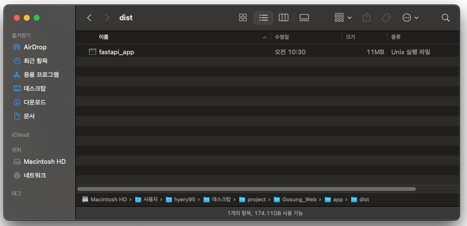์ฑ๊ณต์ ์ผ๋ก ์คํ์ด ์๋ฃ๋๋ฉด 2๊ฐ์ ํด๋(build, dist), 1๊ฐ์ spec ํ์ผ(fastapi_app.spec)์ด ์์ฑ๋๋ค.