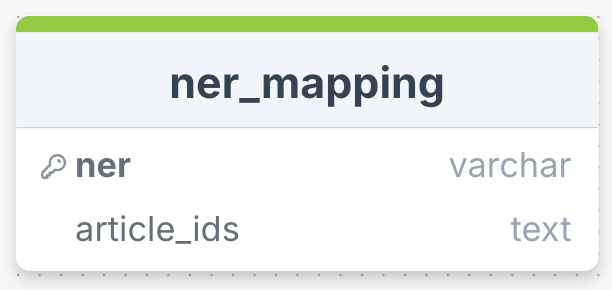 ๊ฒ์ ์๋ ํฅ์์ ์ํด ๋ณ๋์ NER → ๊ธฐ์ฌ ๋ฒํธ mapping ํ ์ด๋ธ ์ถ๊ฐ๋ก ์์ฑ