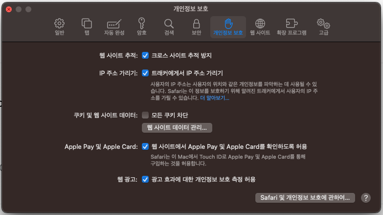 Safari ์ค์ ์์ ์น ์ฌ์ดํธ ๋ฐ์ดํฐ ๊ด๋ฆฌ... → ์ฟ ํค๋ฅผ ์ญ์ ํ๊ธฐ๋ ํ๊ณ